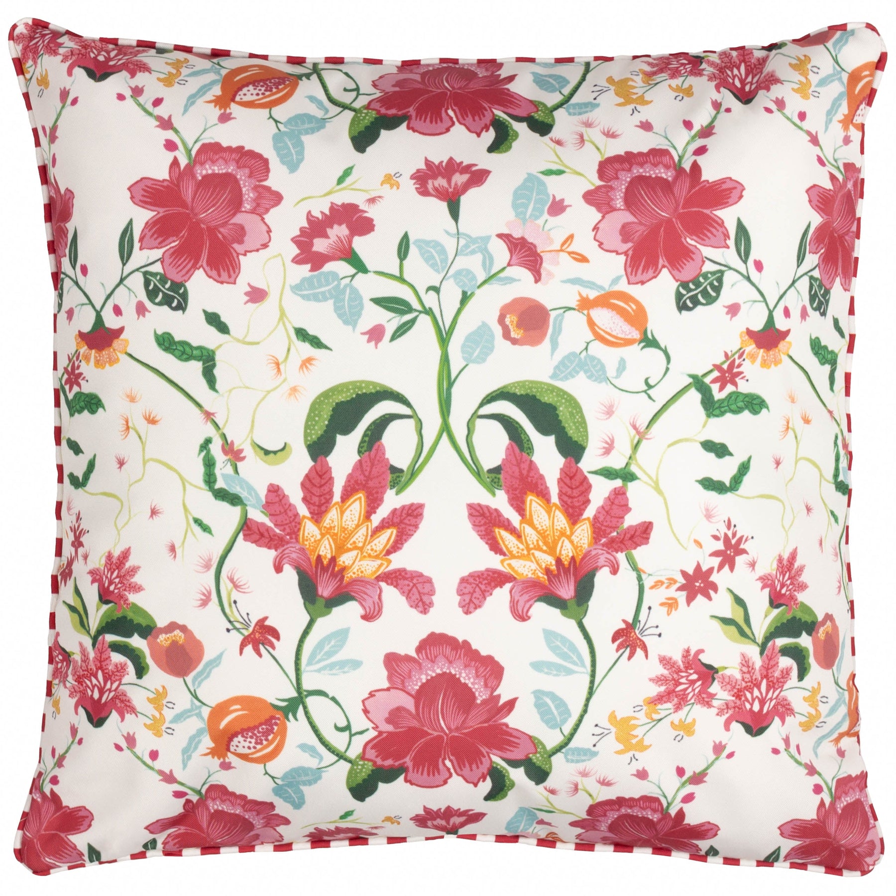 Wylder Nature Candy Red Red Claudia Floral Outdoor Cushions. Floral. Outdoor. Country. Printed. Polyester. 100% Polyester. Elevate your garden with Claudia's intertwining hand-painted floral design. Enjoy a touch of heritage with a classic striped piped trim, lending an elegant finish to any outdoor setting. Crafted from water-resistant materials, this cushion is perfect for use all year round. Featuring a reversible design, showcase either the bold floral print or the versatile striped reverse. Easy zip closure ensures secure use and effortless maintenance, providing lasting comfort. Water Resistant. Zip Closure. Reversible Design. Printed. Add a burst of vibrant charm to your outdoor space with the Claudia Piped Floral Outdoor Cushion. Designed for those who cherish nature-inspired prints, this cushion features a beautifully hand-painted floral pattern that intertwines delicately across its surface, complemented by a heritage-striped piped trim and a striped reverse for a touch of traditional elegance. Its water-resistant fabric ensures you can enjoy its beauty through every season, making it a reliable addition to your garden or patio. Perfectly suited for a modern country aesthetic, the Claudia cushion invites warmth and sophistication into any outdoor setting. Outdoor.