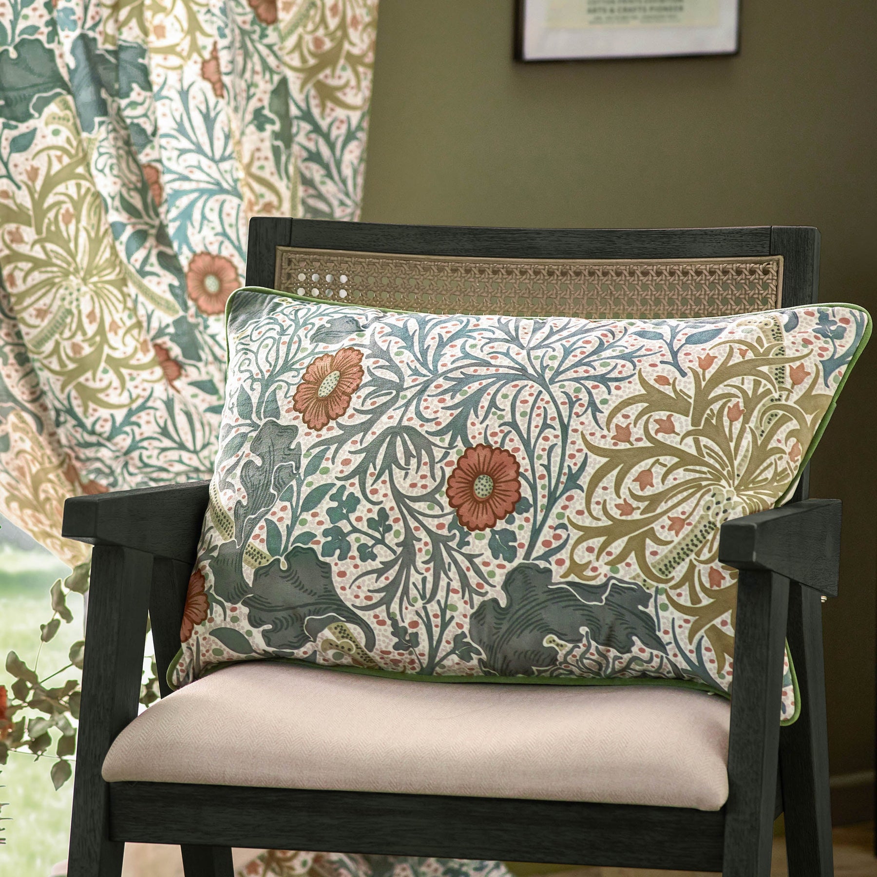 Morris & Co Stone/Sunflower Multi Seaweed Printed Velvet Cushions. Floral. Velvet. Classic. Velvet. Polyester. 100% Polyester. Featuring a free-flowing pattern of underwater plants. Complete with a plain reverse and piped edge, adding a touch of sophistication. Printed onto a luxurious velvet fabric, providing elegance and comfort. Velvet. Printed. Piped Trim. Zip Closure. The Seaweed cushion features a free-flowing pattern that captures the graceful underwater movement of plants, inspired by the sinuous curves of Art Nouveau. This design is an authentic reproduction from a 1901 document in the Morris & Co. archive, originally created by J.H. Dearle. Printed on matte velvet, the cushion exudes a timeless elegance. It is finished with a plain reverse and a piped edge, adding a sophisticated touch. Relaxed.